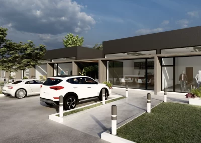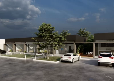 Cuenta con 4 estacionamientos de cortesía de uso público y amplio espacio verde de expansión de los locales de uso compartido ambientado con mobiliario urbano y paisajismo.