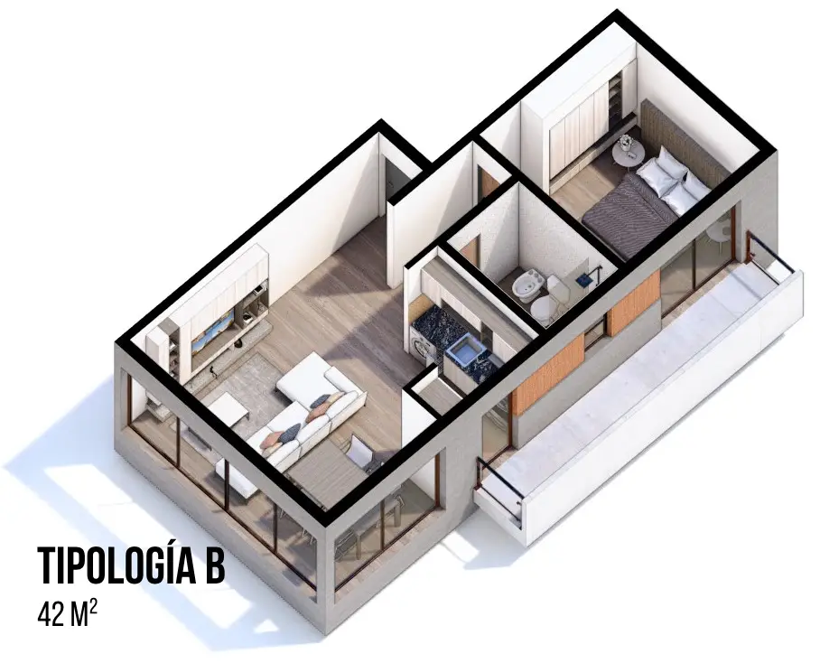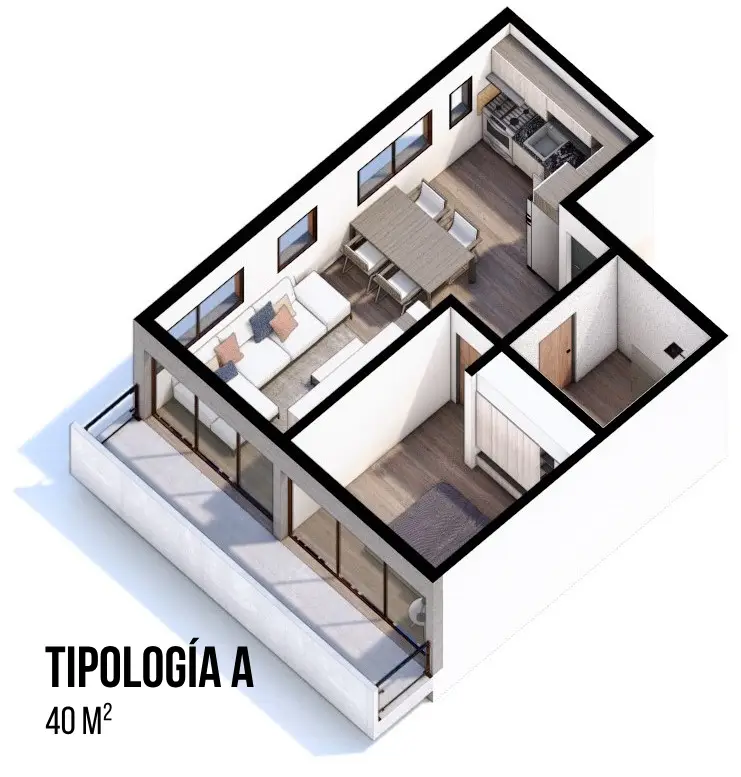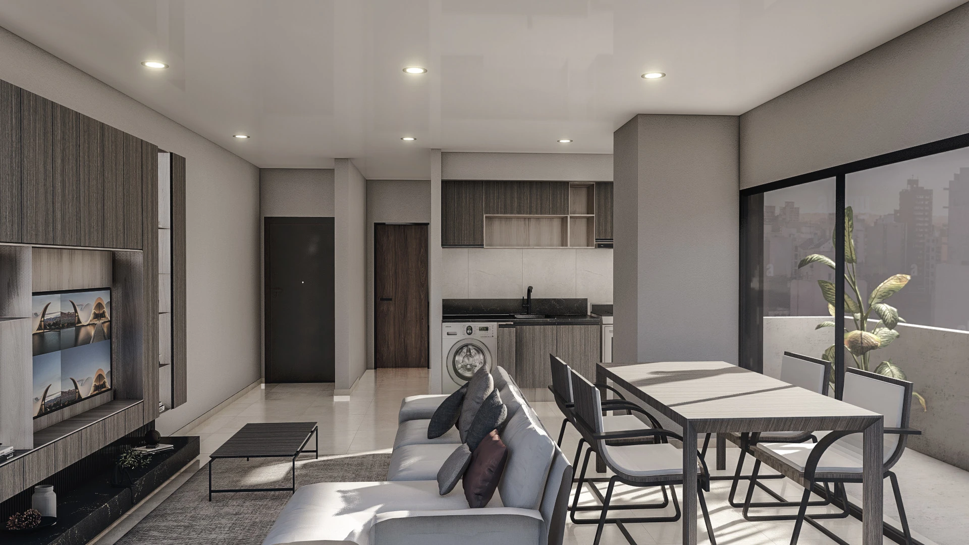 Materialidad: Muros aislados. Aislación de aberturas con material de PVC con doble vidrio hermético. Pisos de porcelanato en living, cocina y baño. Habitaciones con piso vinílico. Posee caldera, cocina, bajo/sobre mesada y frente de placares. Paredes con doble masillado. Calefacción por radiadores. Materialidad exteriores: pintura texturado negro, revestimiento símil madera pvc/sanding y diseño de balcones hormigón visto y vidrio.